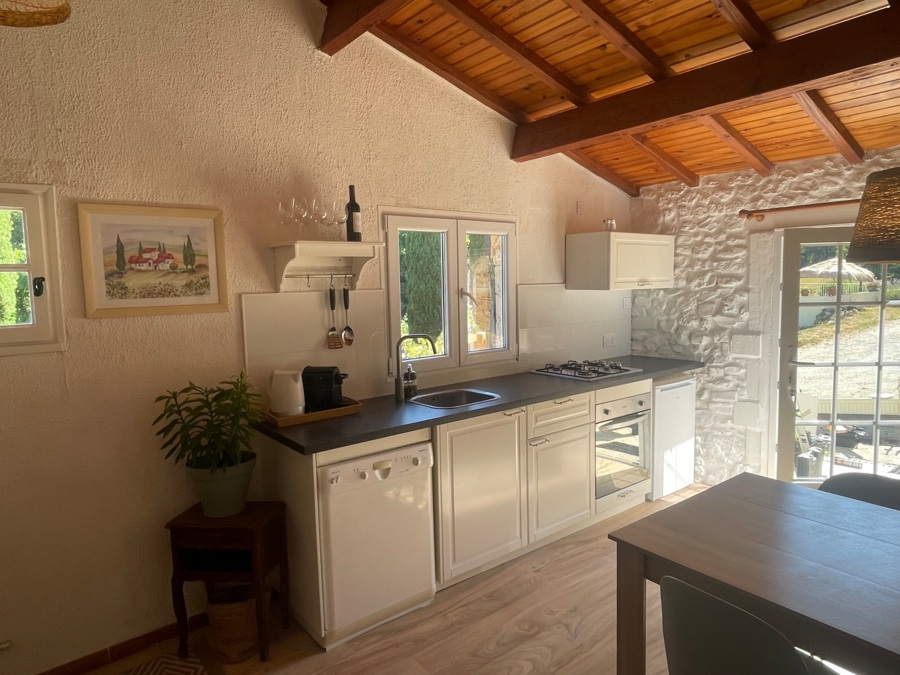 In the gîte, a brand-new kitchen has now been installed – part of a pleasant, open living space where you can cook, dine and relax.
