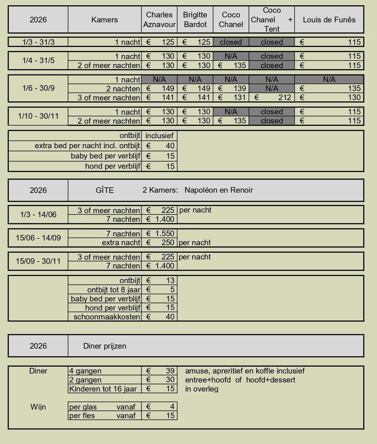 standaardprijzen (incl. alle faciliteiten, excl. toeristenbelasting € 1 p.p.p.n.).